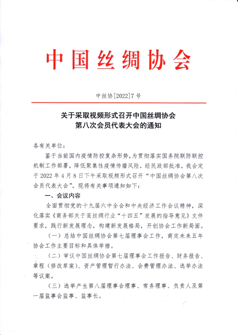 中国丝绸协会第八次会员代表大会的通知
