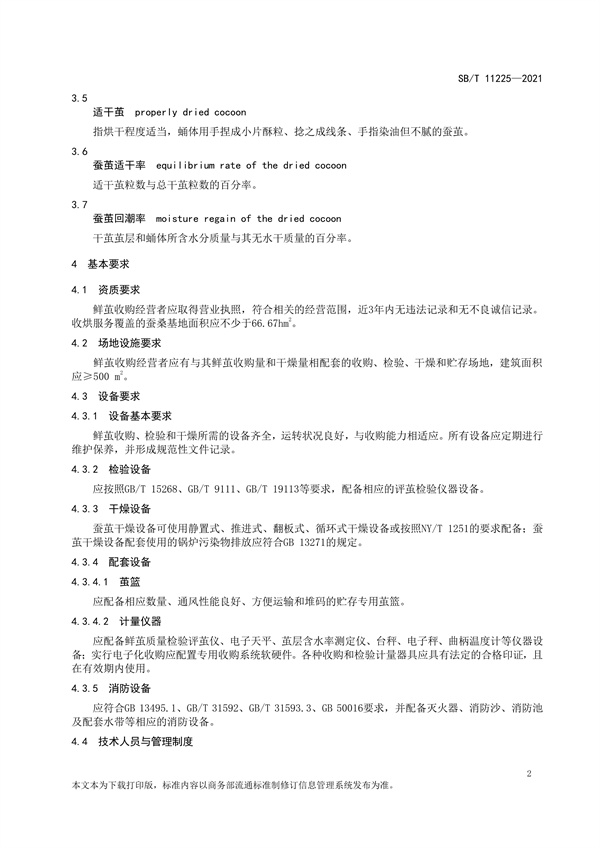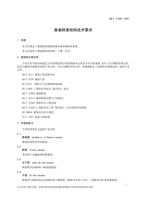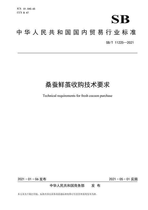 《桑蚕鲜茧收购技术要求》(SB/T11225-2021)经商务部公告,已于2021年5月1日正式实施。